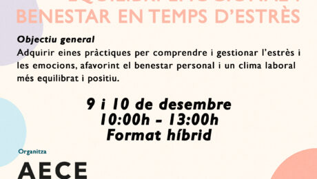 T’invitem a la formació/networking “Equilibri emocional i benestar en temps d’estrès”, pensada per dotar-te d’eines pràctiques per comprendre i gestionar l’estrès i les emocions, afavorint el benestar personal i un clima laboral més positiu. Objectiu general Adquirir eines pràctiques per comprendre i gestionar l’estrès i les emocions, afavorint el benestar personal i un clima laboral